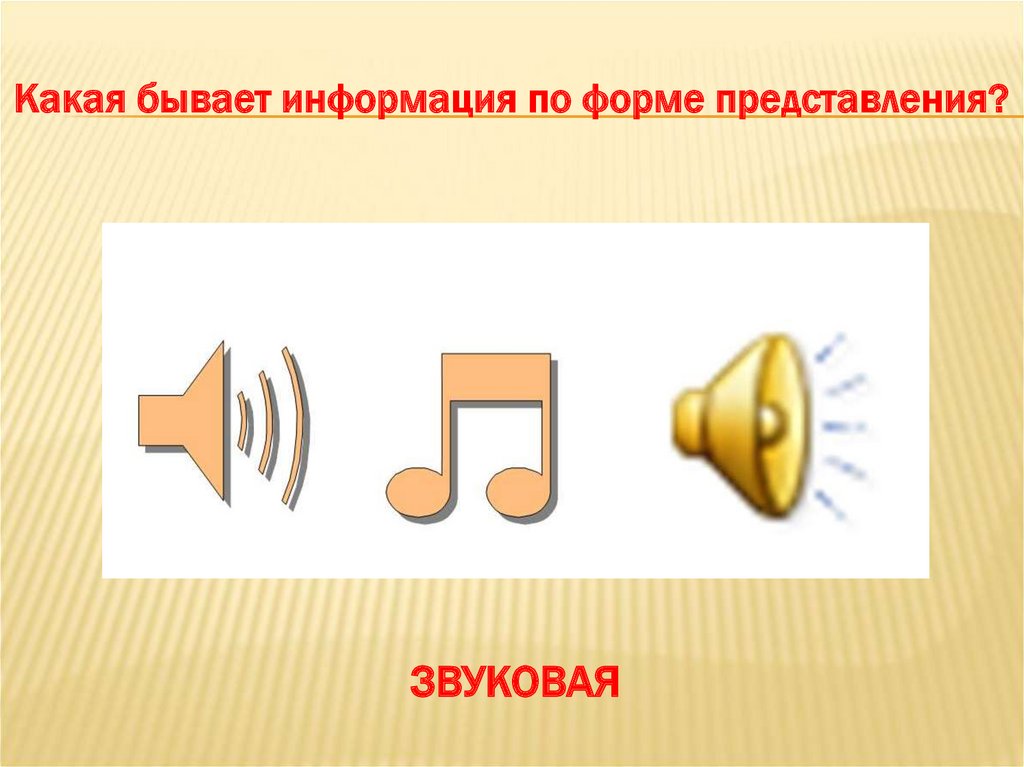 Какая бывает информация по форме представления?ЗВУКОВАЯ
