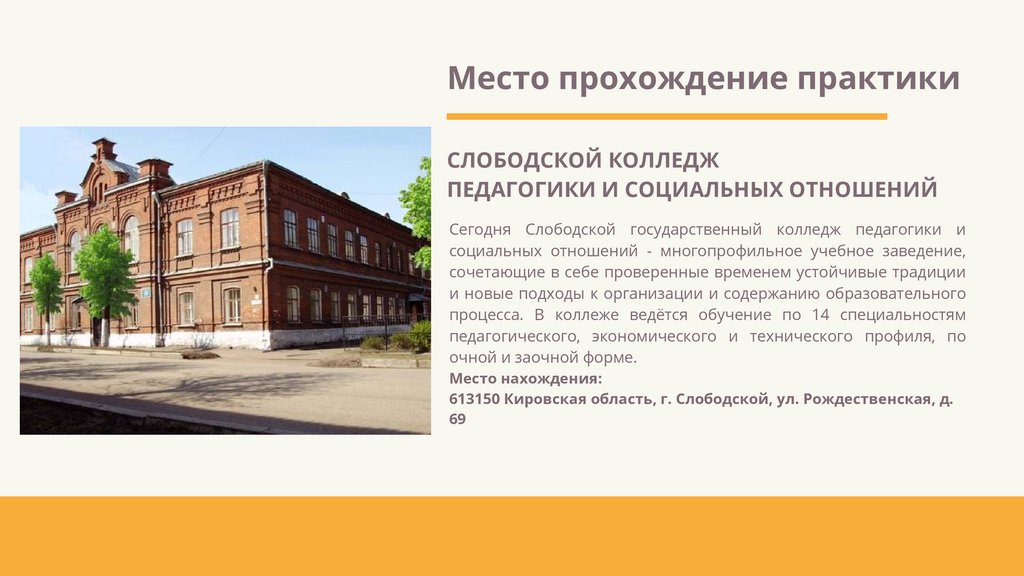 Место прохождение практикиСЛОБОДСКОЙ КОЛЛЕДЖ