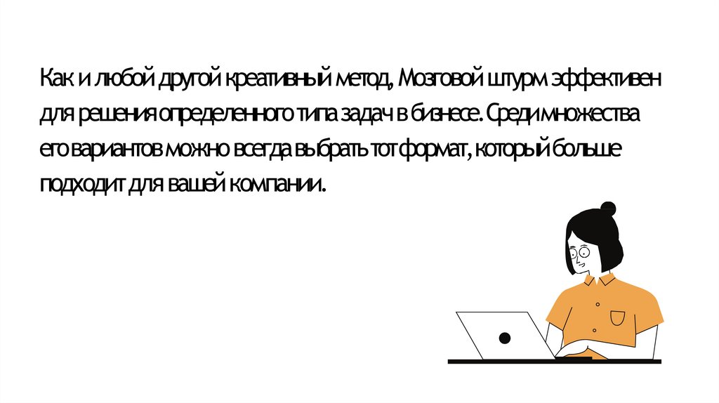 Какилюбойдругойкреативныйметод,Мозговойштурмэффективендля решенияопределенноготипа задач в бизнесе.Средимножества