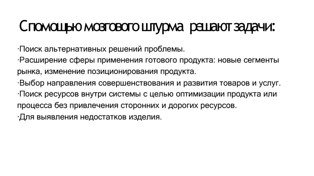 Спомощьюмозговогоштурма решаютзадачи:·Поиск альтернативных решений проблемы.