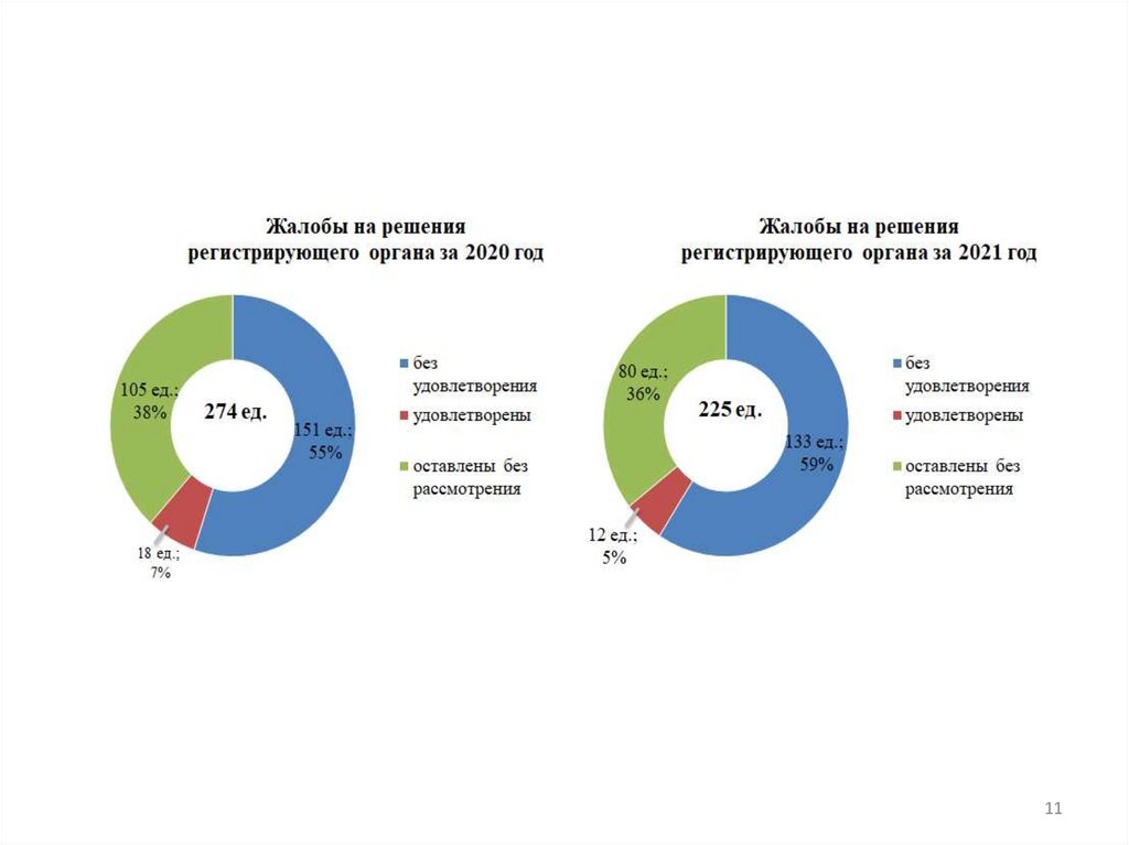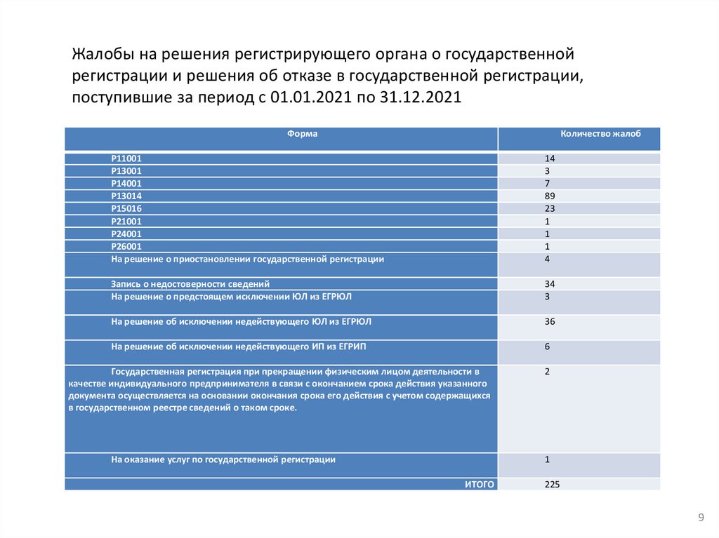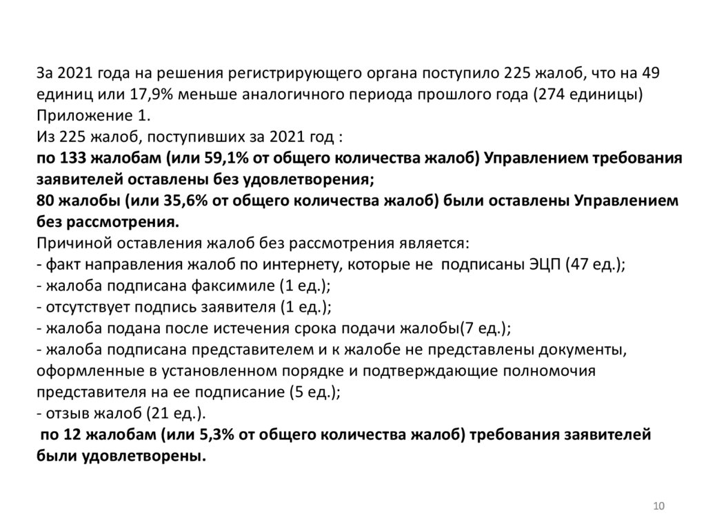 За 2021 года на решения регистрирующего органа поступило 225 жалоб, что на 49единиц или 17,9% меньше аналогичного периода прошлого года (274 единицы)