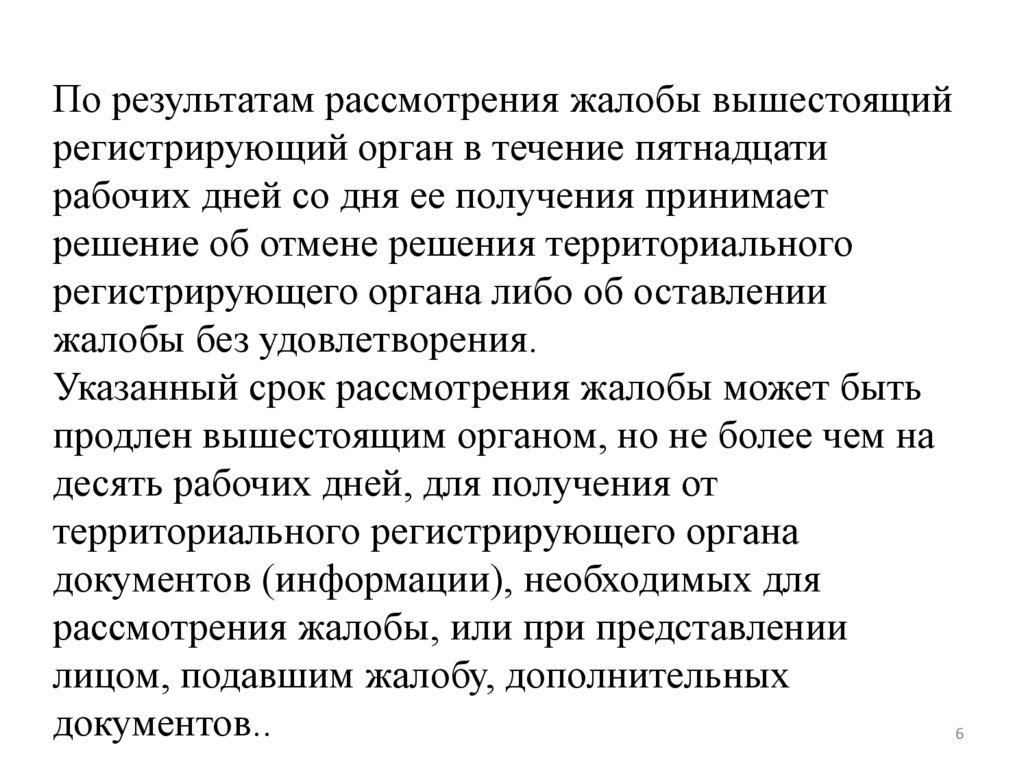 По результатам рассмотрения жалобы вышестоящийрегистрирующий орган в течение пятнадцати