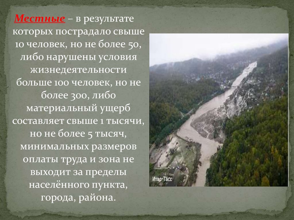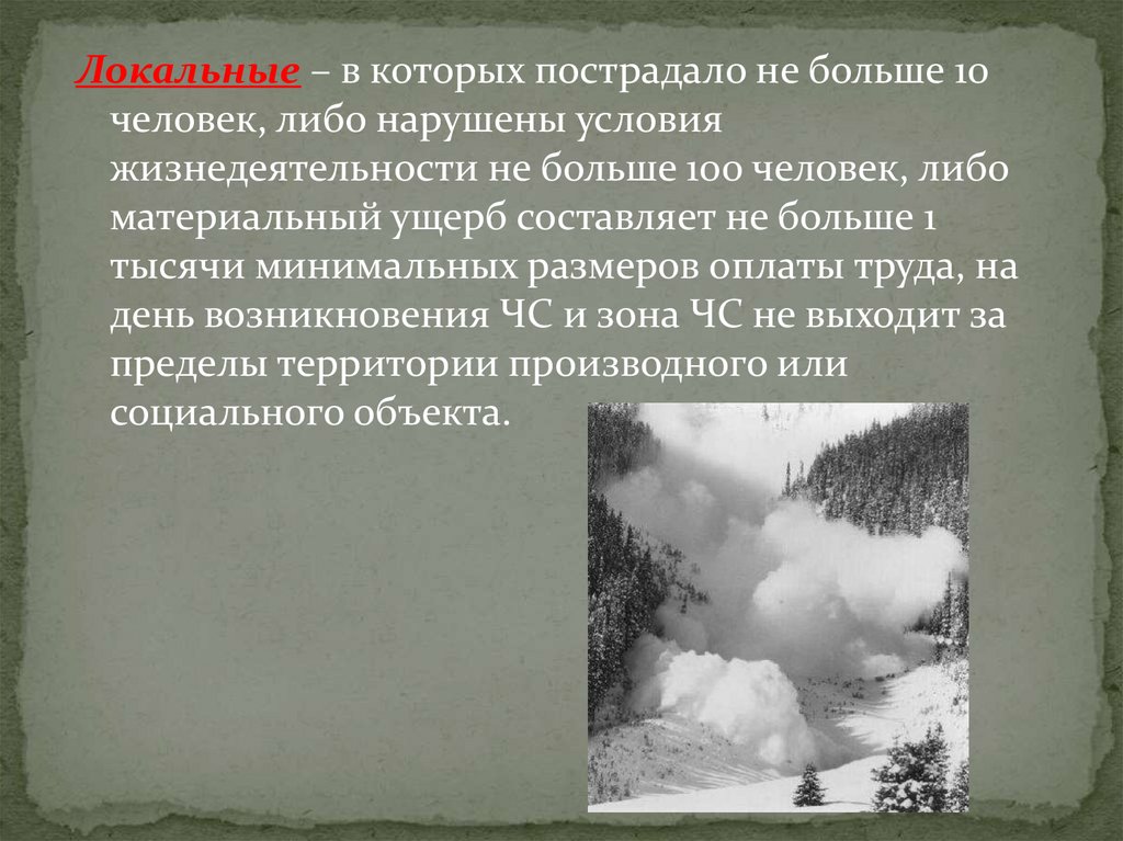 Локальные – в которых пострадало не больше 10человек, либо нарушены условия