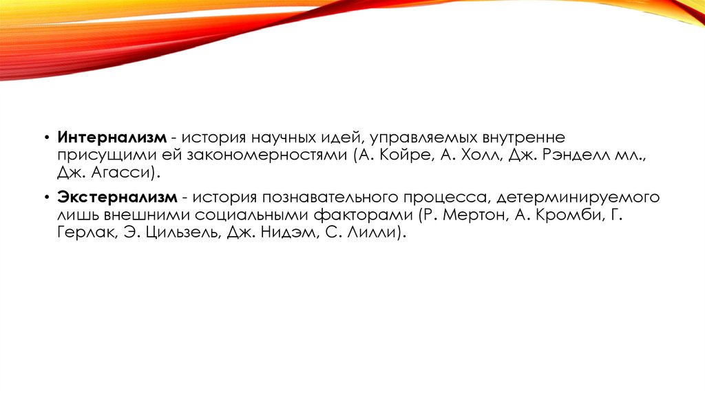 • Интернализм - история научных идей, управляемых внутреннеприсущими ей закономерностями (А. Койре, А. Холл, Дж. Рэнделл мл.,