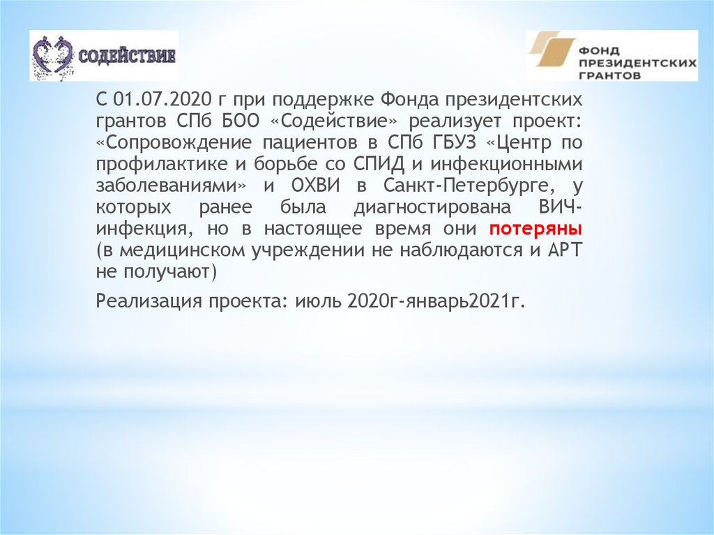 1. Сопровождение «потерянных» пациентов в СПб ГБУЗ Центр СПИД