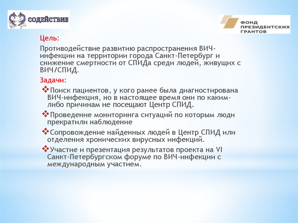 Цель:Противодействие развитию распространения ВИЧинфекции на территории города Санкт-Петербург и