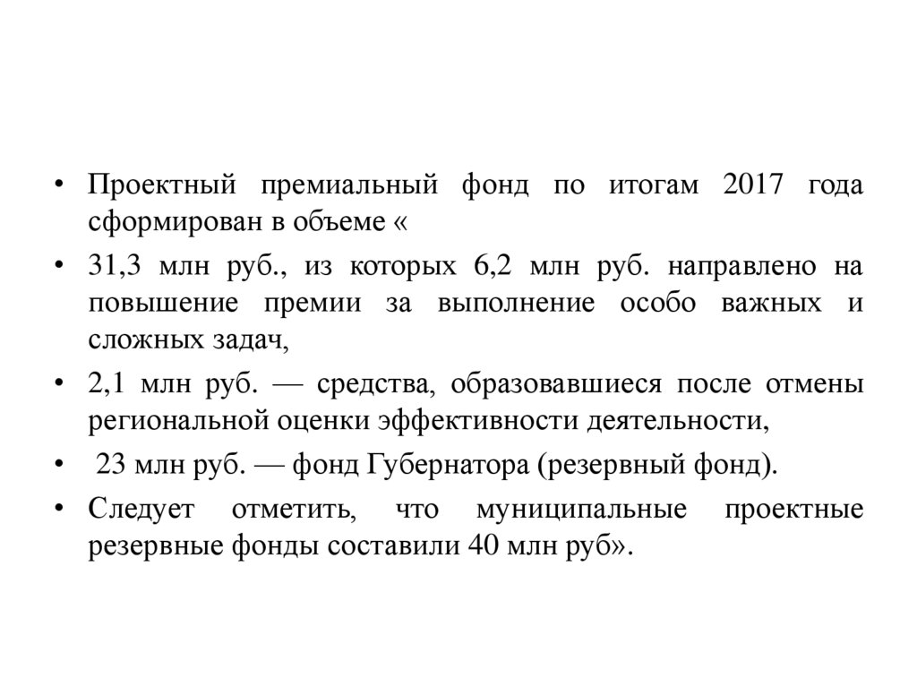 • Проектный премиальный фонд по итогам 2017 годасформирован в объеме «