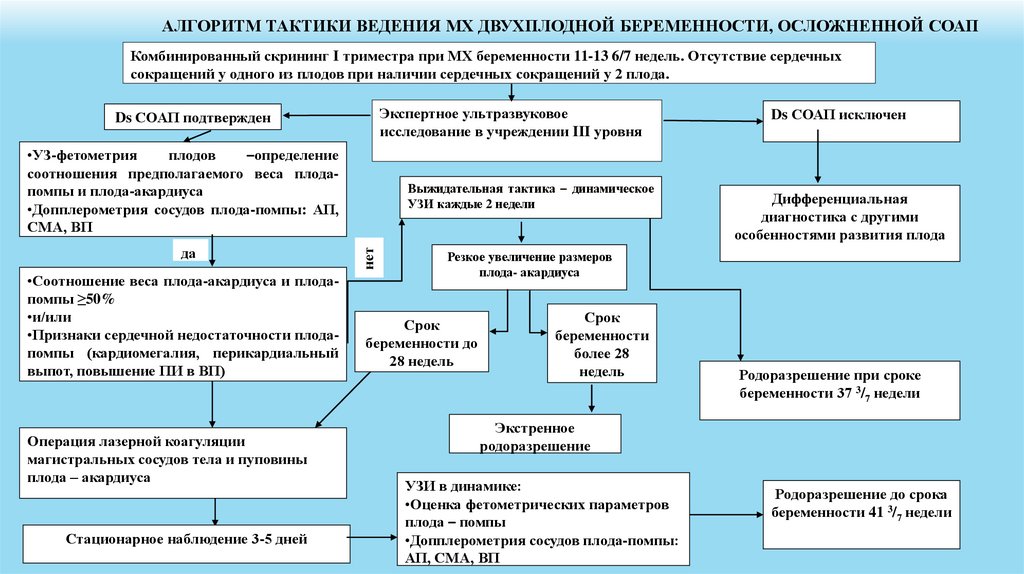 АЛГОРИТМ ТАКТИКИ ВЕДЕНИЯ МХ ДВУХПЛОДНОЙ БЕРЕМЕННОСТИ, ОСЛОЖНЕННОЙ СОАПКомбинированный скрининг I триместра при МХ беременности 11-13 6/7 недель. Отсутствие сердечных