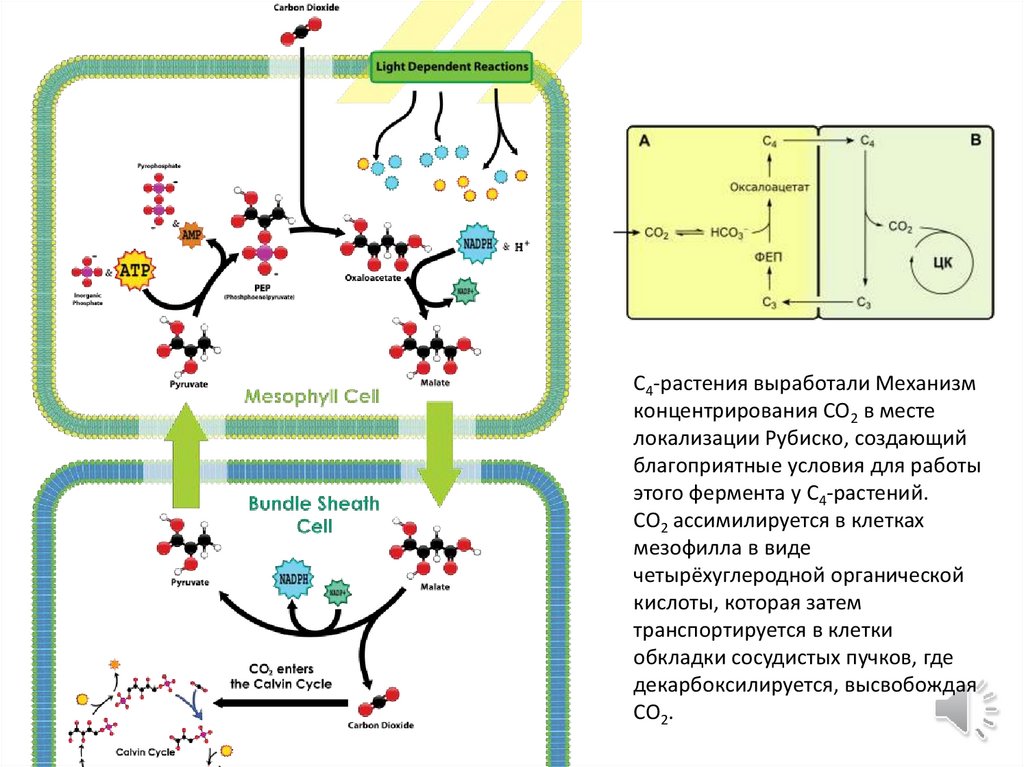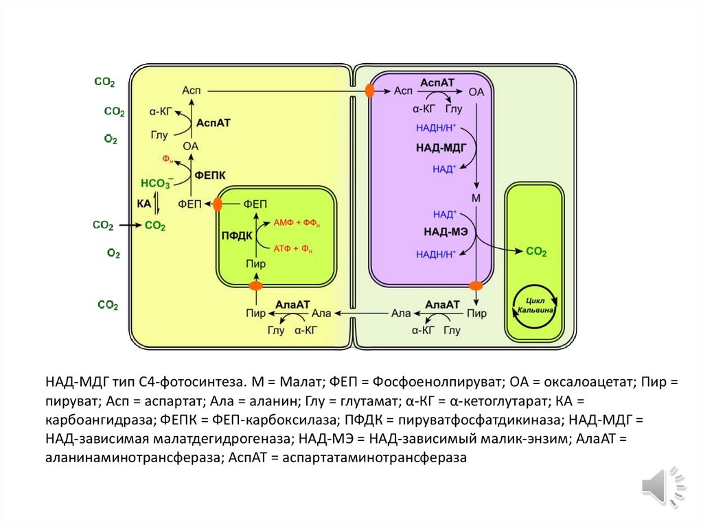 карбоангидраза; ФЕПК = ФЕП-карбоксилаза; ПФДК = пируватфосфатдикиназа; НАД-МДГ =
