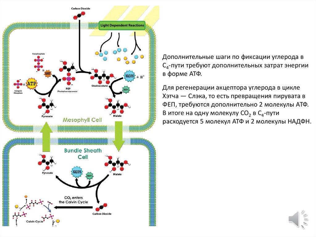 карбоангидраза; ФЕПК = ФЕП-карбоксилаза; ПФДК = пируватфосфатдикиназа; НАДФ-МДГ =