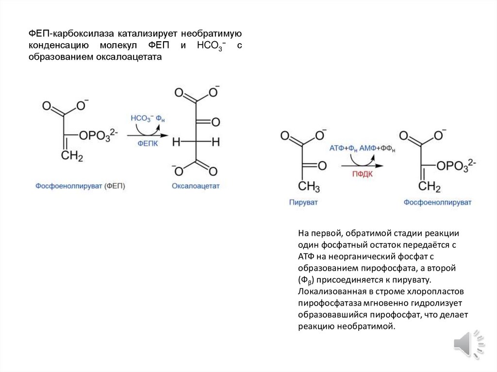 ФЕП-карбоксилаза катализирует необратимуюконденсацию молекул ФЕП и HCO3− с