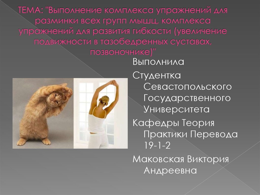 1. ТЕМА: "Выполнение комплекса упражнений для разминки всех групп мышц, комплекса упражнений для развития гибкости (увеличение