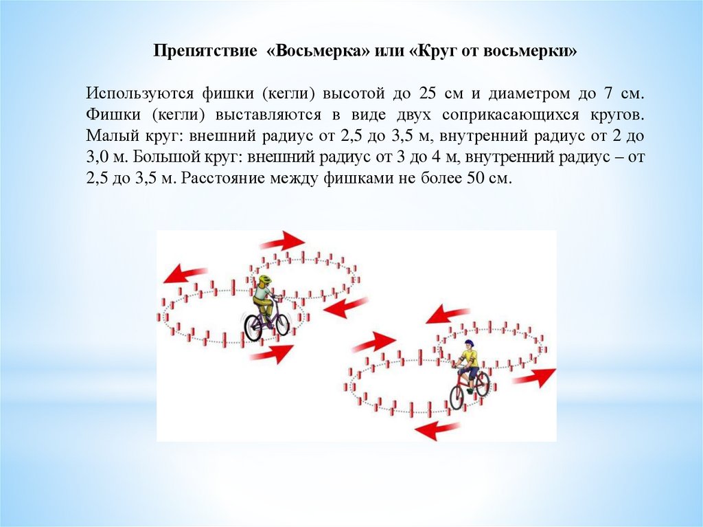 Препятствие «Восьмерка» или «Круг от восьмерки»Используются фишки (кегли) высотой до 25 см и диаметром до 7 см.