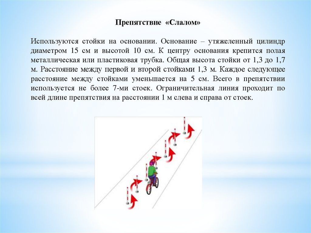 Препятствие «Слалом»Используются стойки на основании. Основание – утяжеленный цилиндр
