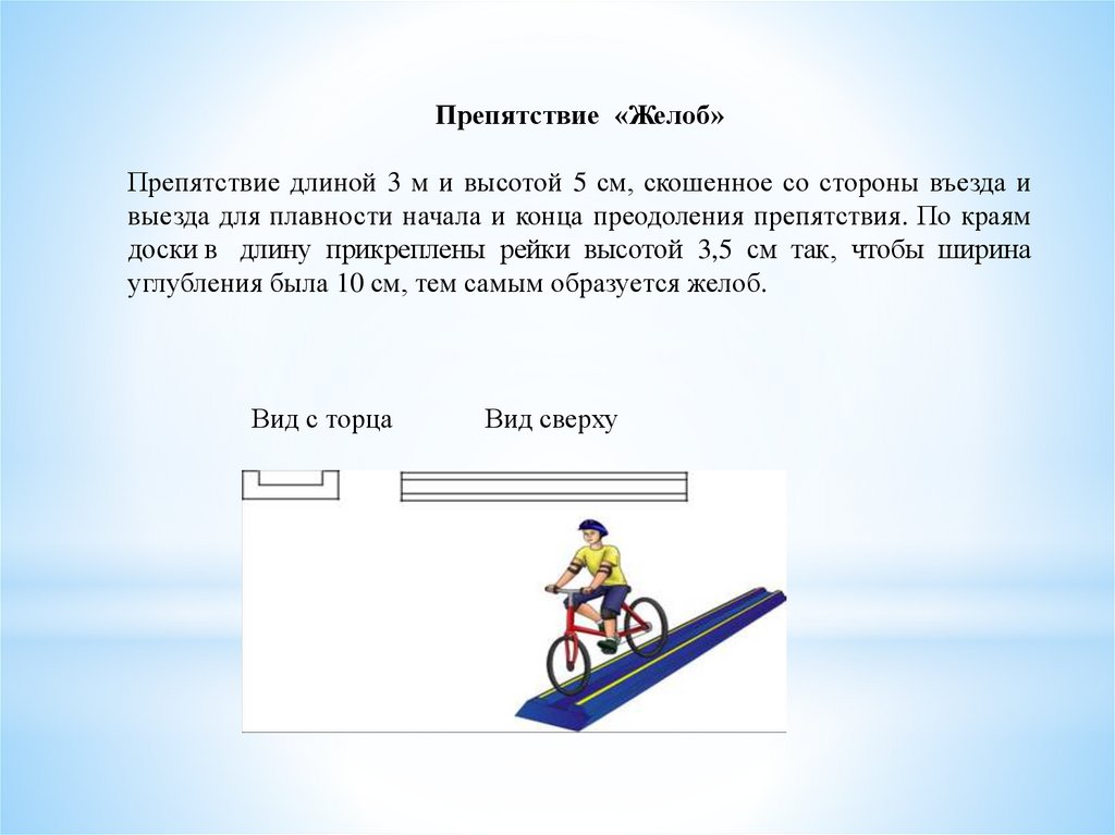 Препятствие «Желоб»Препятствие длиной 3 м и высотой 5 см, скошенное со стороны въезда и