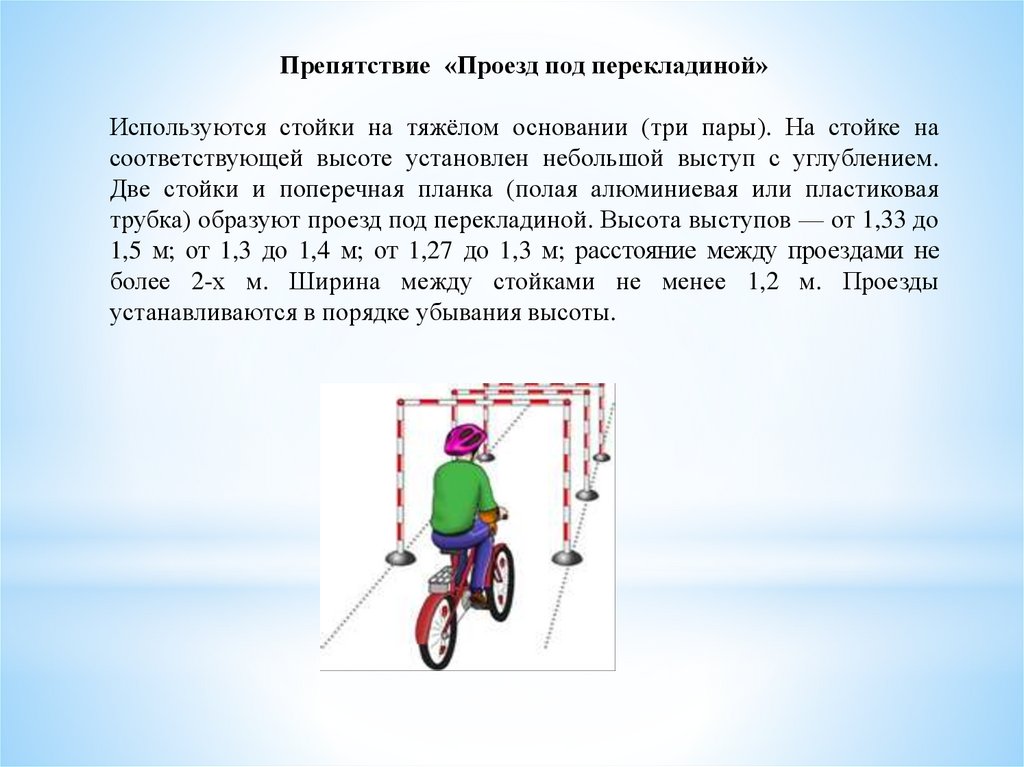 Препятствие «Проезд под перекладиной»Используются стойки на тяжёлом основании (три пары). На стойке на