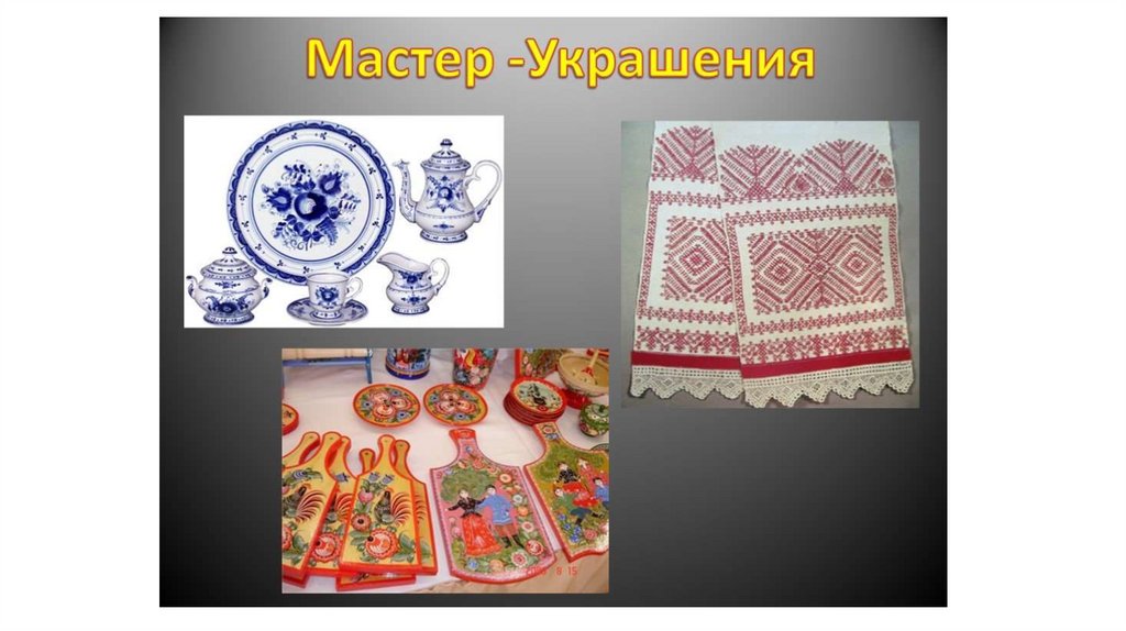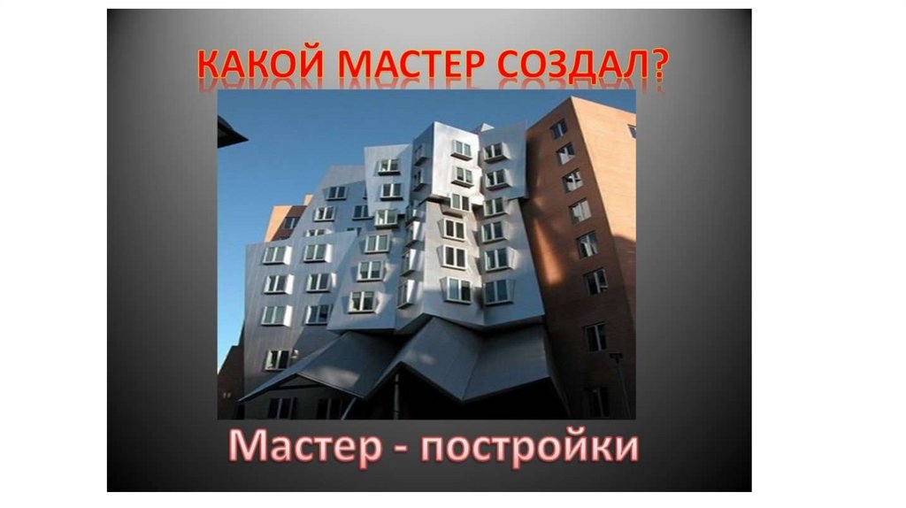 о чем говорят украшения, украшать разные предметы и постройки; мастер постройки – строить, создавать новые вещи.)