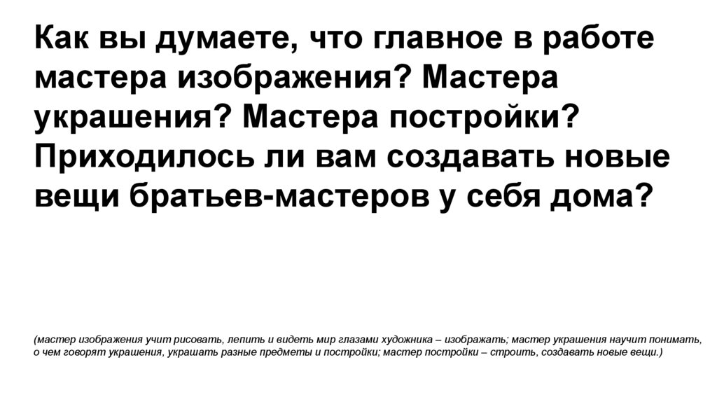 (мастер изображения учит рисовать, лепить и видеть мир глазами художника – изображать; мастер украшения научит понимать,
