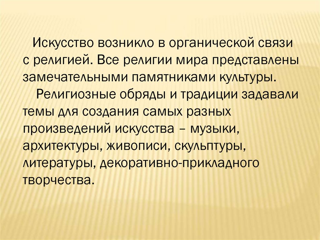 Искусство возникло в органической связис религией. Все религии мира представлены