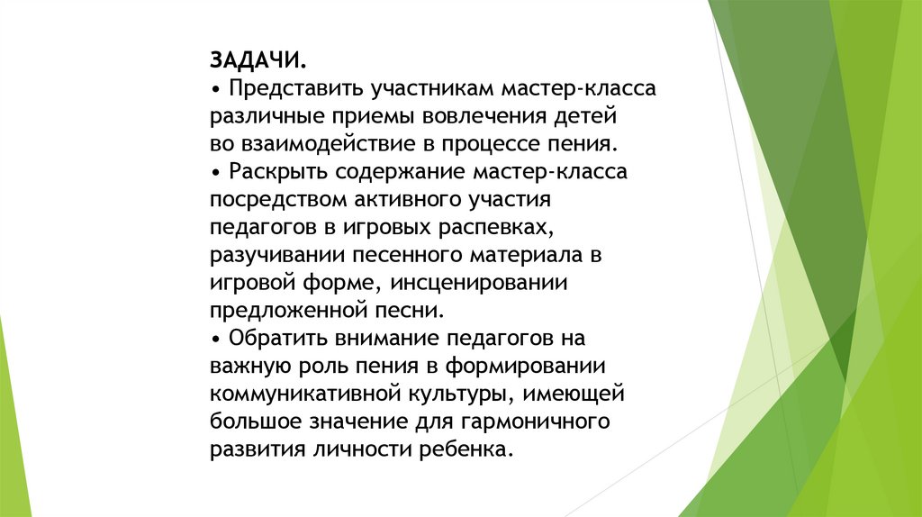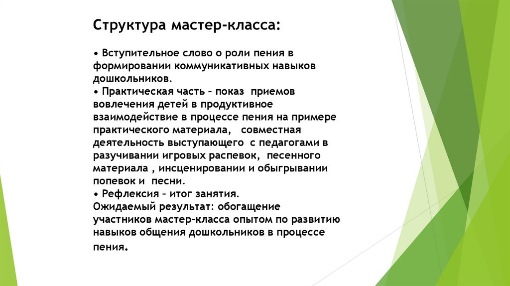 Структура мастер-класса:• Вступительное слово о роли пения в