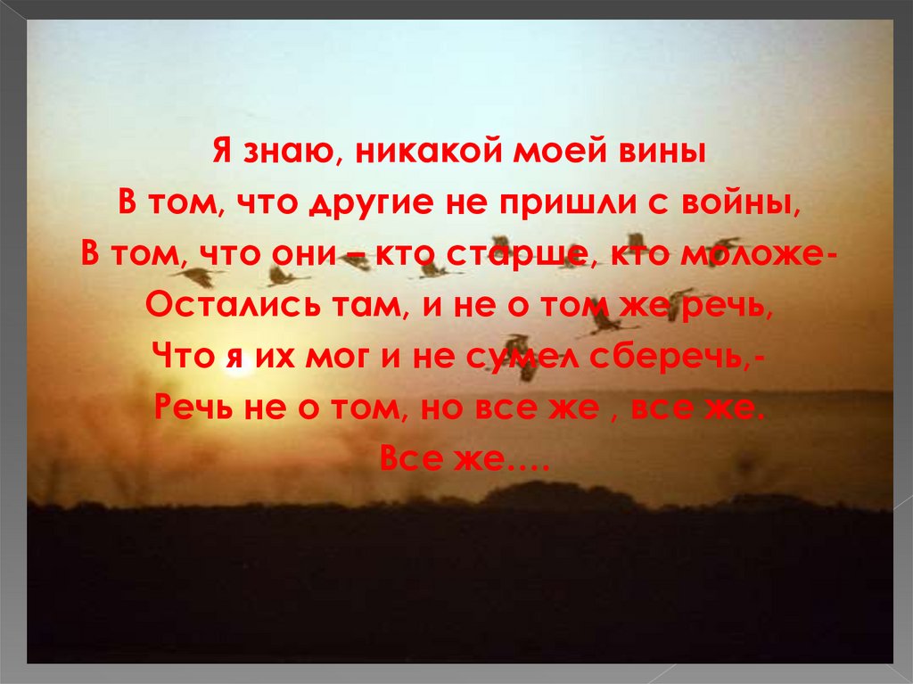 Я знаю, никакой моей виныВ том, что другие не пришли с войны,