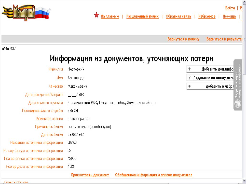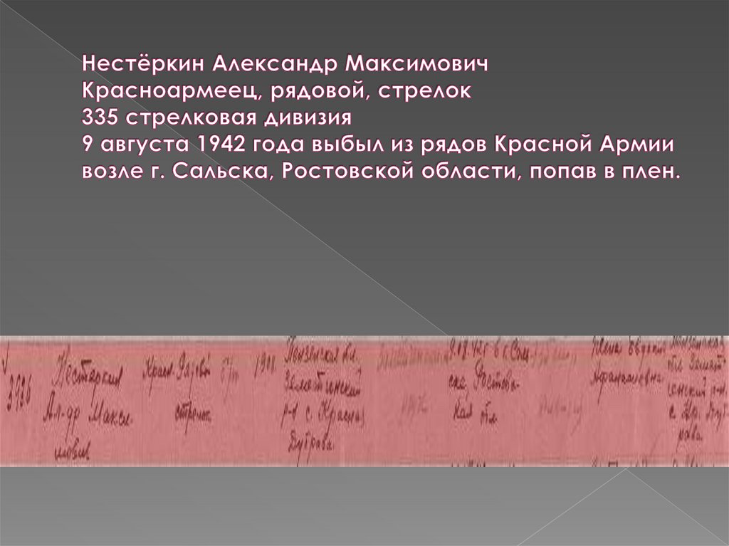 7. Нестёркин Александр Максимович Красноармеец, рядовой, стрелок 335 стрелковая дивизия 9 августа 1942 года выбыл из рядов Красной