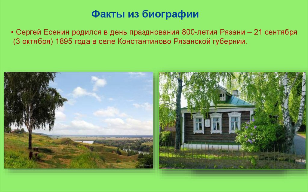 Факты из биографии• Сергей Есенин родился в день празднования 800-летия Рязани – 21 сентября