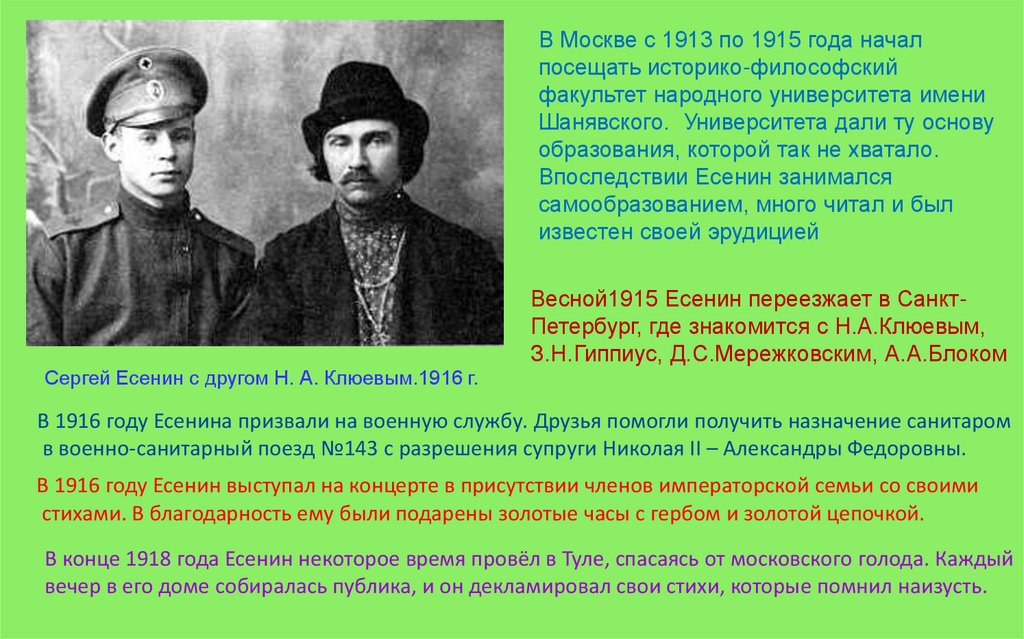 Весной1915 Есенин переезжает в СанктПетербург, где знакомится с Н.А.Клюевым,