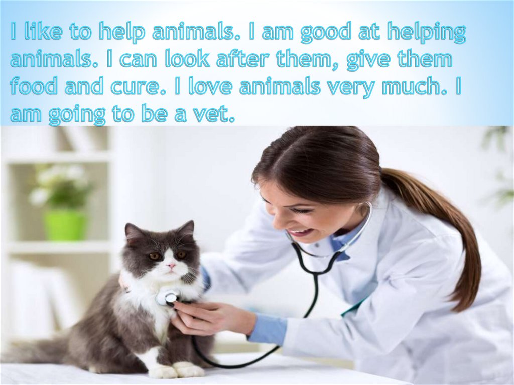 My dream job is to be a vet. This doctor helps animals. I love them very much. They are my friends.