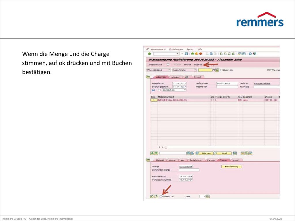 Auftrag auswählen und auf Wareneingang buchen drücken.Remmers Gruppe AG – Alexander Zilke, Remmers International