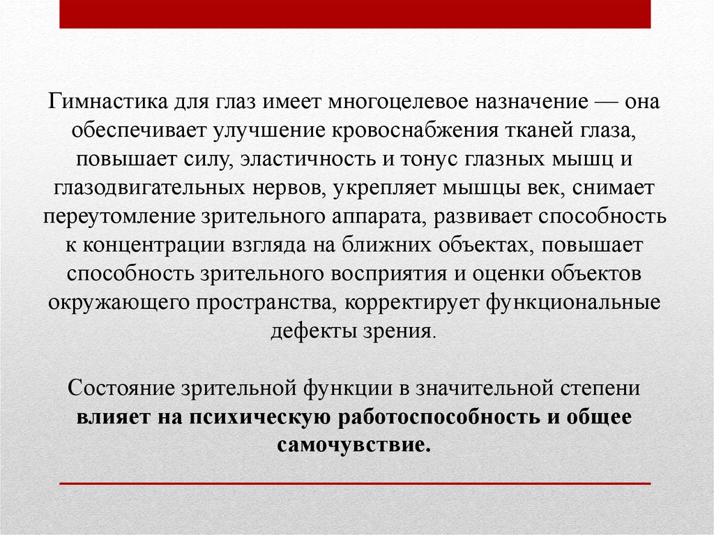 Гимнастика для глаз имеет многоцелевое назначение — онаобеспечивает улучшение кровоснабжения тканей глаза,