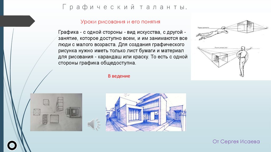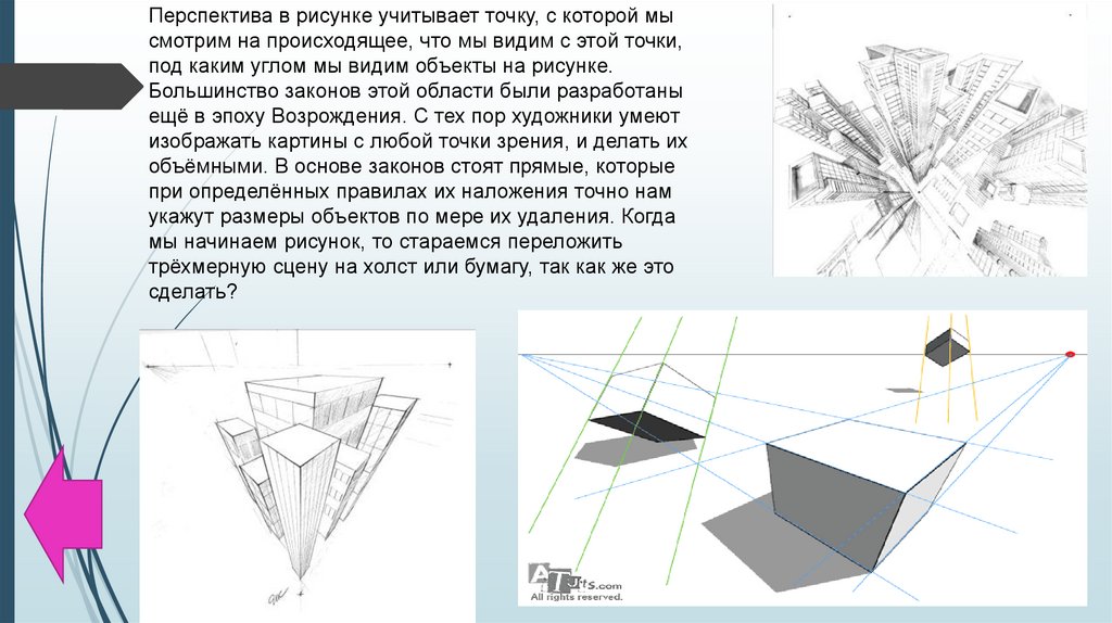 Перспектива в рисунке учитывает точку, с которой мысмотрим на происходящее, что мы видим с этой точки,