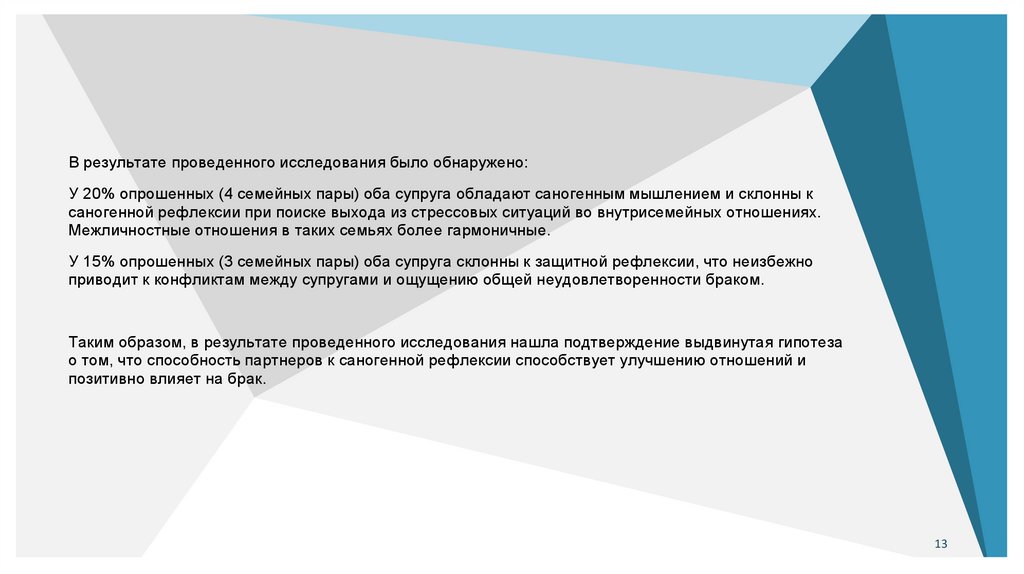 В результате проведенного исследования было обнаружено:У 20% опрошенных (4 семейных пары) оба супруга обладают саногенным мышлением и склонны к