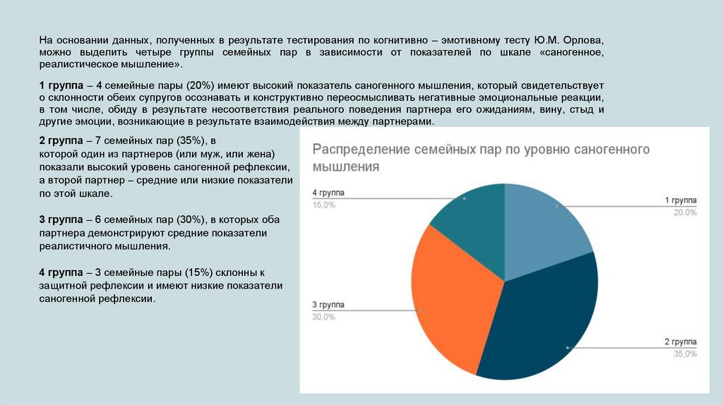 На основании данных, полученных в результате тестирования по когнитивно – эмотивному тесту Ю.М. Орлова,можно выделить четыре группы семейных пар в зависимости от показателей по шкале «саногенное,
