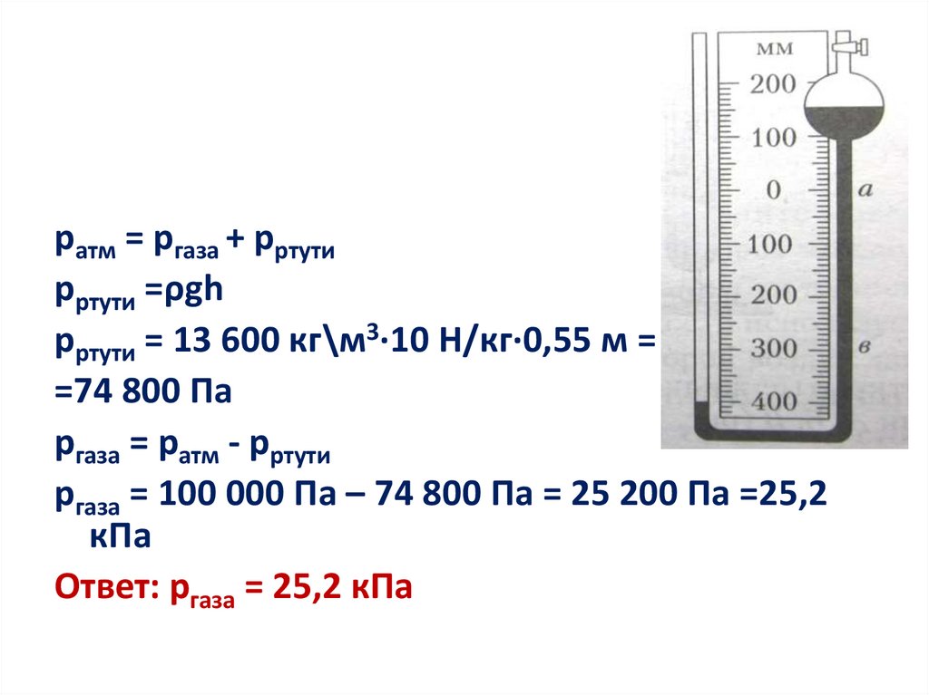 ргаза = 100 000 Па – 74 800 Па = 25 200 Па =25,2