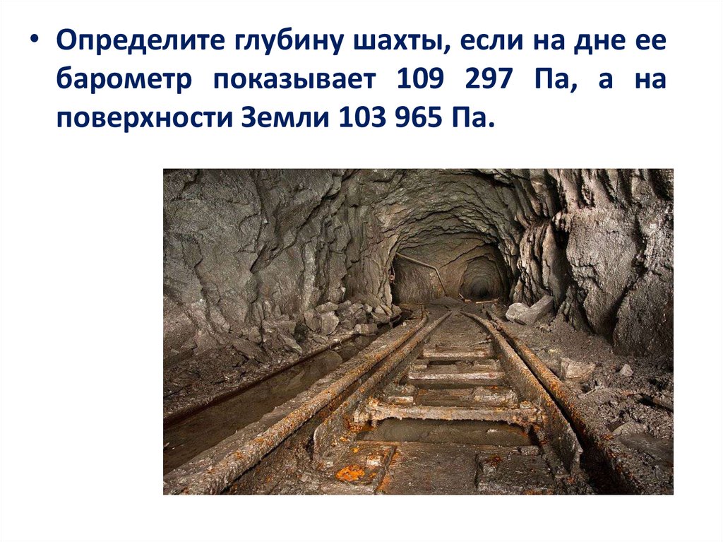 • Определите глубину шахты, если на дне еебарометр показывает 109 297 Па, а на