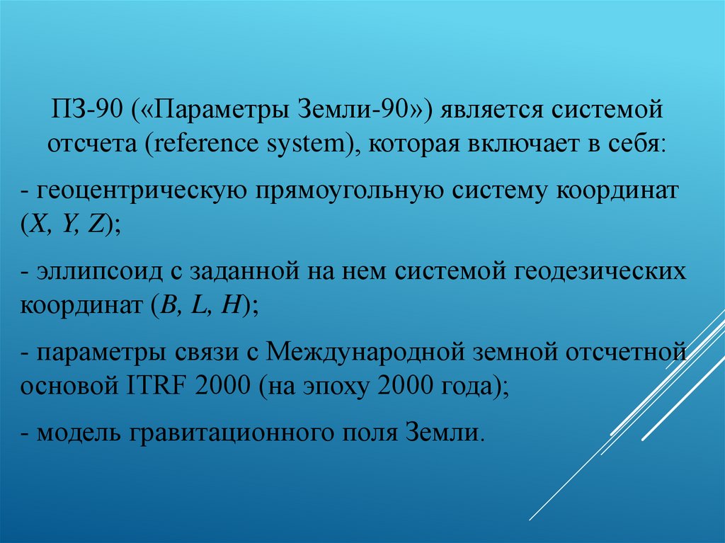 ПЗ-90 («Параметры Земли-90») является системойотсчета (reference system), которая включает в себя: