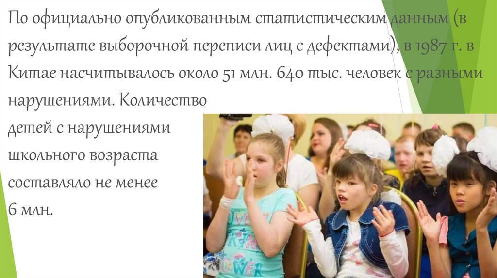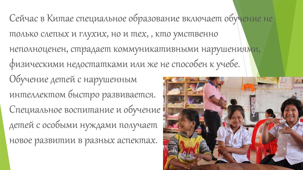 Сейчас в Китае специальное образование включает обучение нетолько слепых и глухих, но и тех, , кто умственно