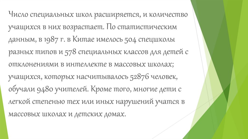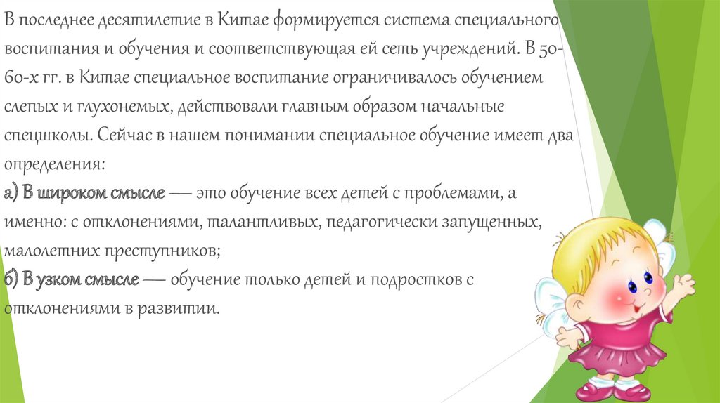 В последнее десятилетие в Китае формируется система специальноговоспитания и обучения и соответствующая ей сеть учреждений. В 5060-х гг. в Китае специальное воспитание ограничивалось обучением