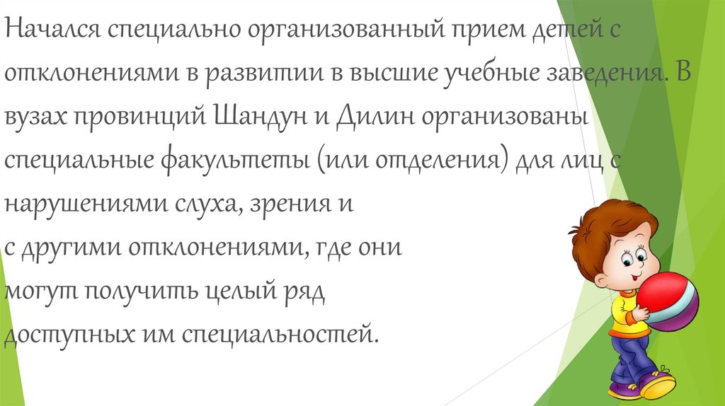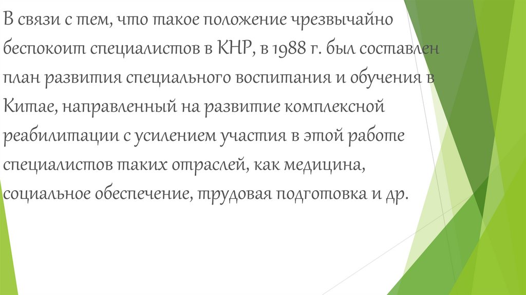 Начата специальная подготовка специальных педагогов. Еще 20лет тому назад в Китае не было специальных учебных