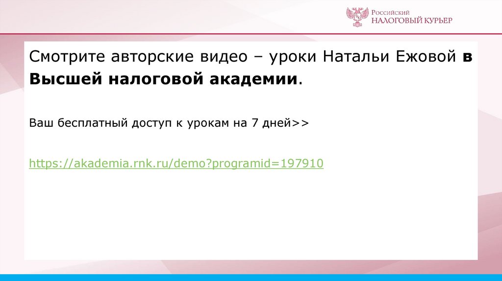 Смотрите авторские видео – уроки Натальи Ежовой вВысшей налоговой академии.