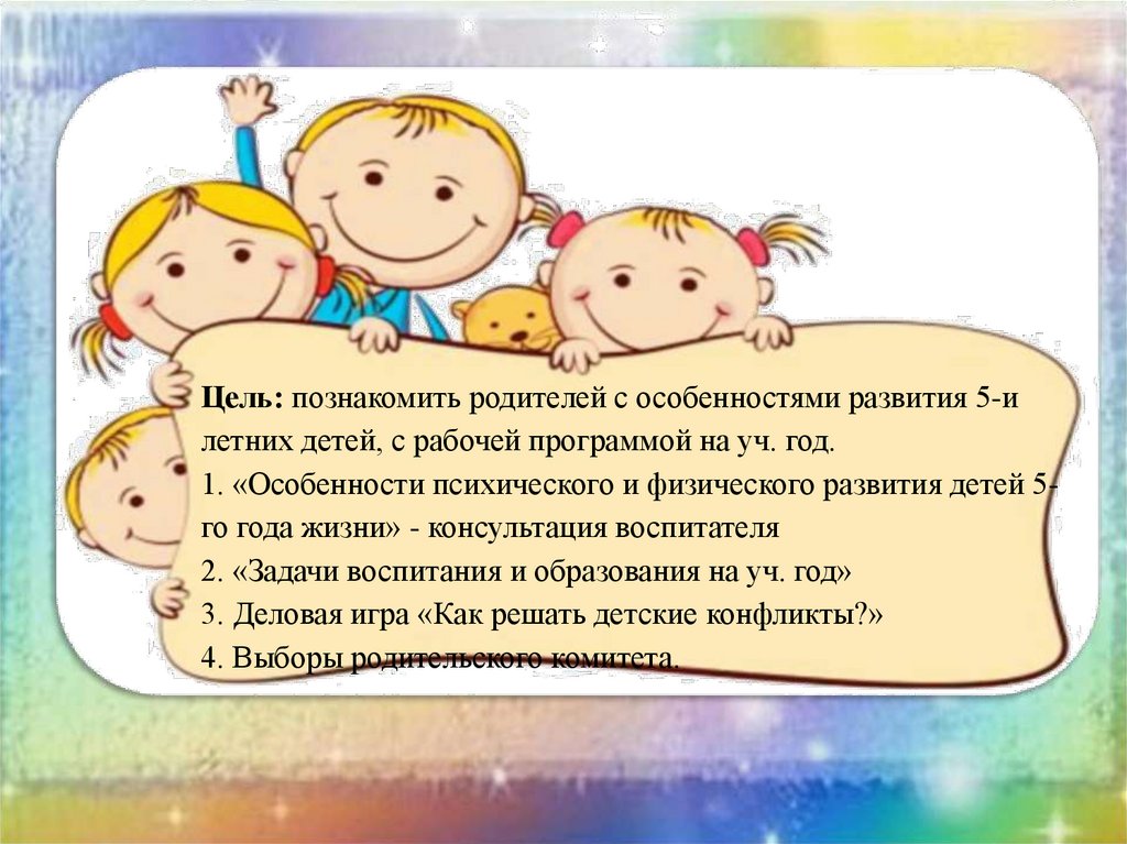 Цель: познакомить родителей с особенностями развития 5-илетних детей, с рабочей программой на уч. год.