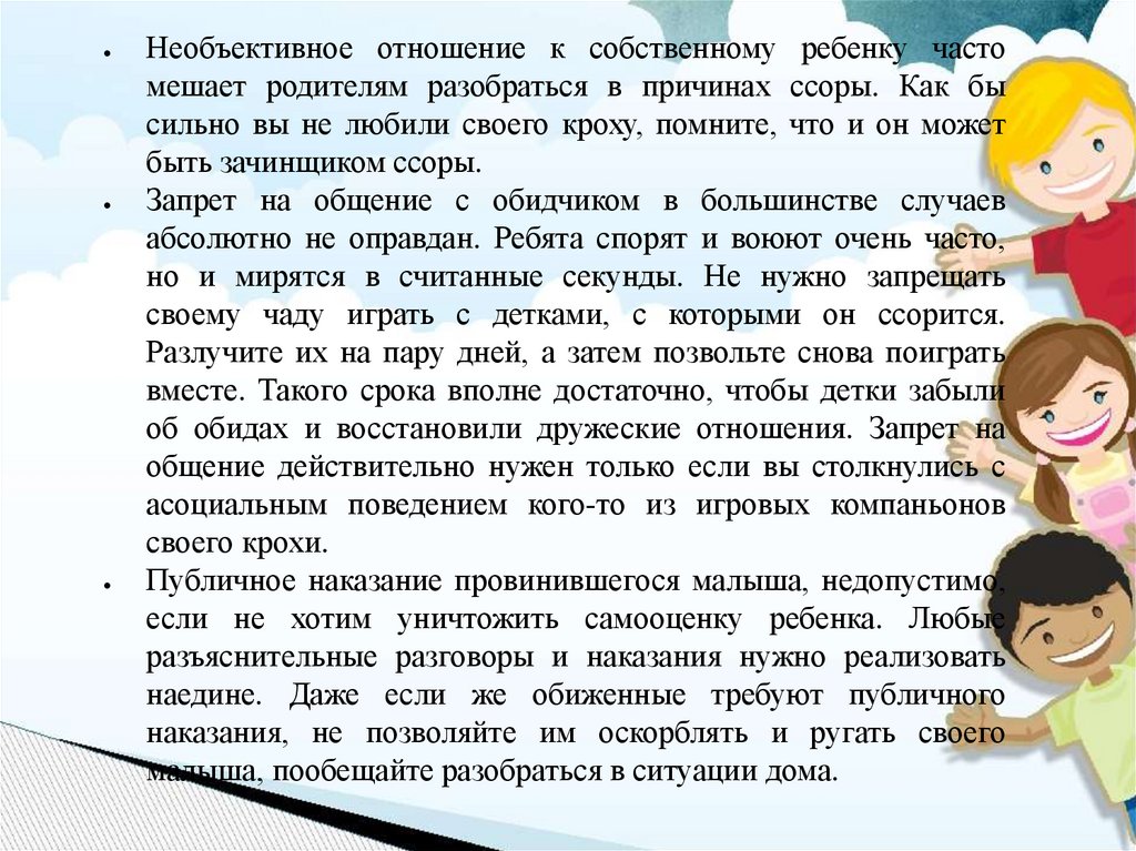 Необъективное отношение к собственному ребенку частомешает родителям разобраться в причинах ссоры. Как бы