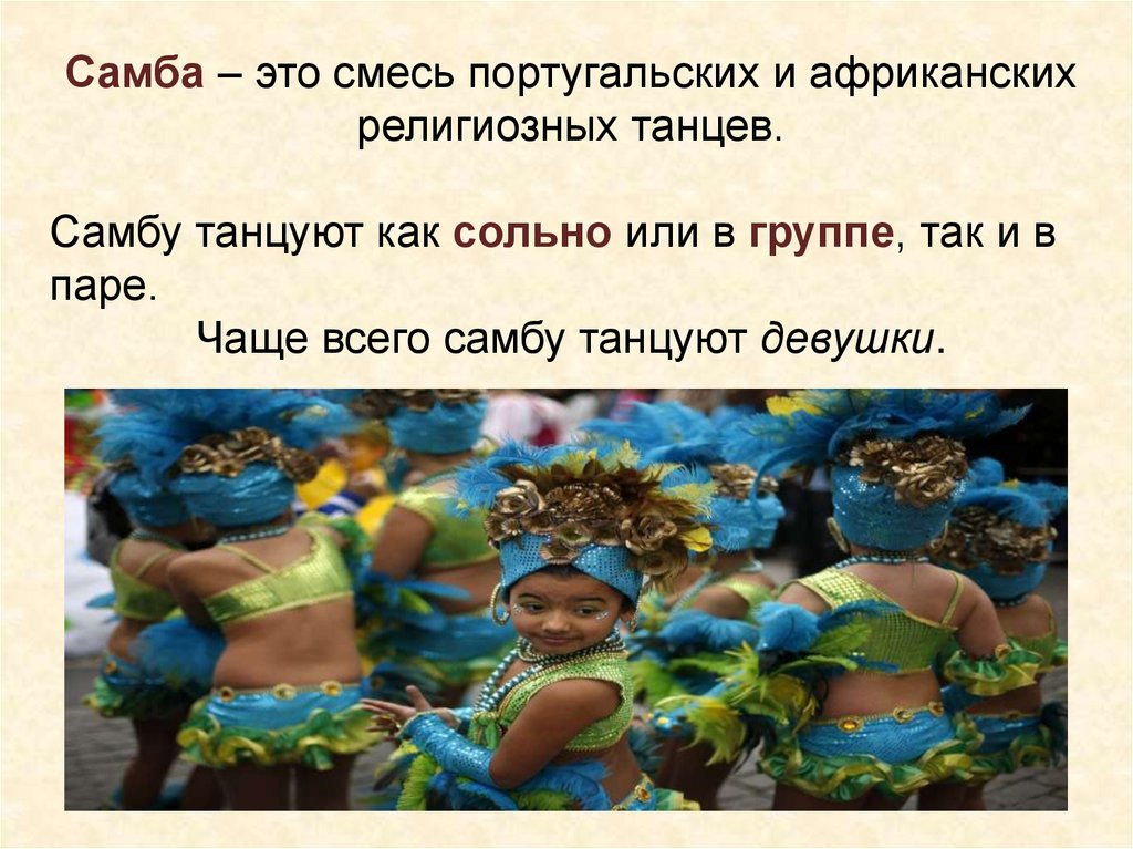 Самба – это смесь португальских и африканскихрелигиозных танцев.