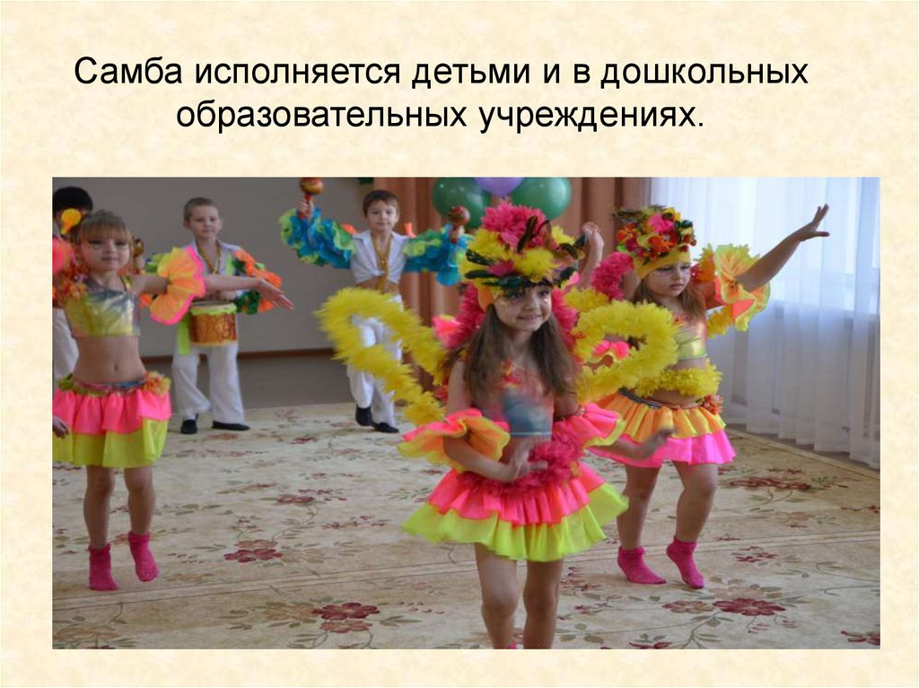 Самба исполняется детьми и в дошкольныхобразовательных учреждениях.