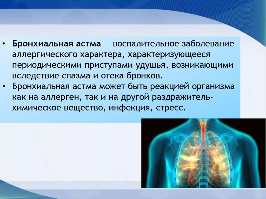 • Бронхиальная астма — воспалительное заболеваниеаллергического характера, характеризующееся