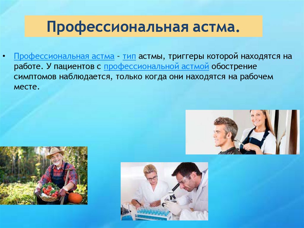 Профессиональная астма.• Профессиональная астма – тип астмы, триггеры которой находятся на