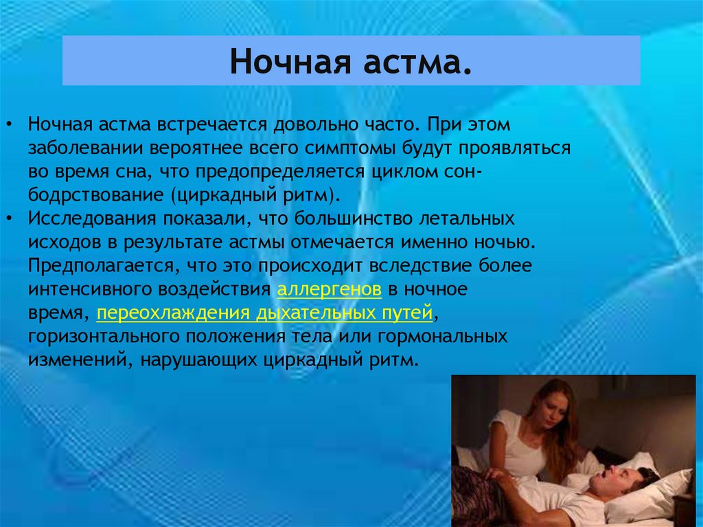 Ночная астма.• Ночная астма встречается довольно часто. При этом