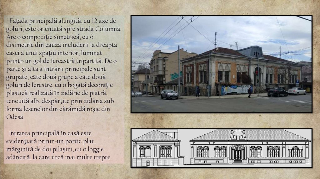Faţada principală alungită, cu 12 axe degoluri, este orientată spre strada Columna.