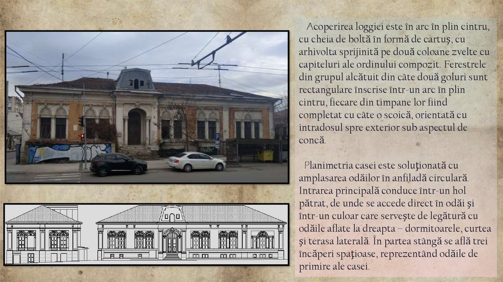 Acoperirea loggiei este în arc în plin cintru,cu cheia de boltă în formă de cartuş, cu